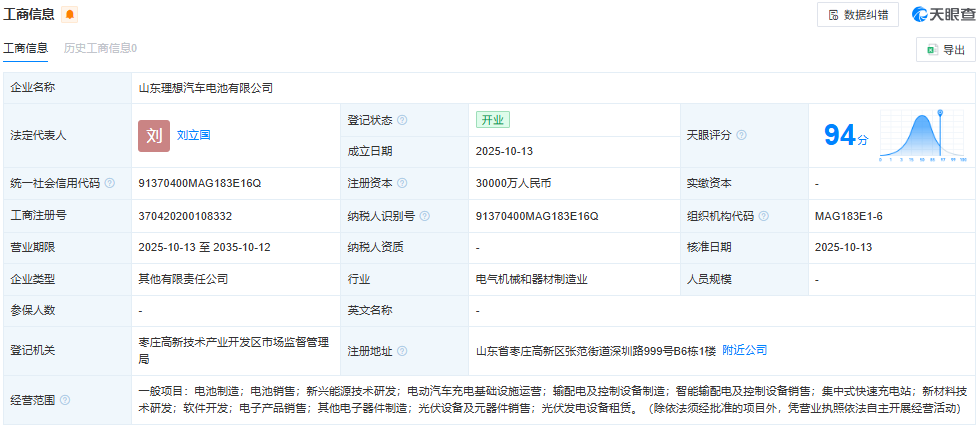 天眼查显示,山东理想汽车电池有限公司于10月13日注册成立,注册资本3亿元,注册地址位于山东省枣庄高新区张范街道深圳路999号B6栋1楼。