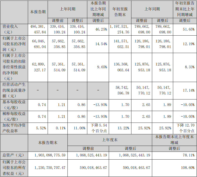 其中,第三季度营收为4.96亿元,同比增长46.25%,归母净利润为6604.67万元,同比增长14.54%;扣非净利润为6289.93万元,同比增长9.65%。