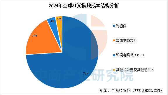 中商产业研究院发布的《2025-2030年中国光模块行业前景与市场趋势洞察专题研究报告》显示,AI光模块的原材料成本结构主要包括光器件、集成电路芯片、印刷电路板(PCB)及其他(外壳及其他组件),其中,光器件是最主要的成本构成部分,占光模块总成本的74%,集成电路芯片也占相对较大的成本比例,约为19%。