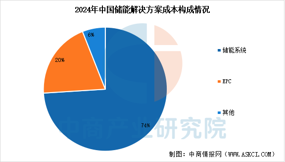 中商产业研究院发布的《2025-2030年中国储能系统深度分析及发展前景研究预测报告》显示,储能解决方案的成本主要由储能系统和相关服务构成,其中储能系统占据核心地位,其成本占比约为74%,EPC占比约为20%,其他主要包括运维等服务,占比6%。