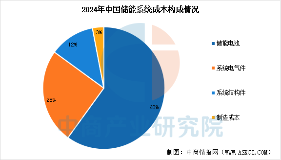 中商产业研究院发布的《2025-2030年中国储能系统深度分析及发展前景研究预测报告》显示,从储能系统成本构成来看,储能电池成本占比最大,约60%,系统电气件、系统结构件成本占比分别约25%和12%。