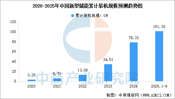 中商产业研究院发布的《2025-2030年中国新型储能市场深度分析及发展前景研究预测报告》显示,截至2024年底,中国新型储能累计装机规模达到78.32GW,较上年增长126.95%。截至2025年上半年,中国新型储能累计装机规模达到101.3GW,首次突破100GW。