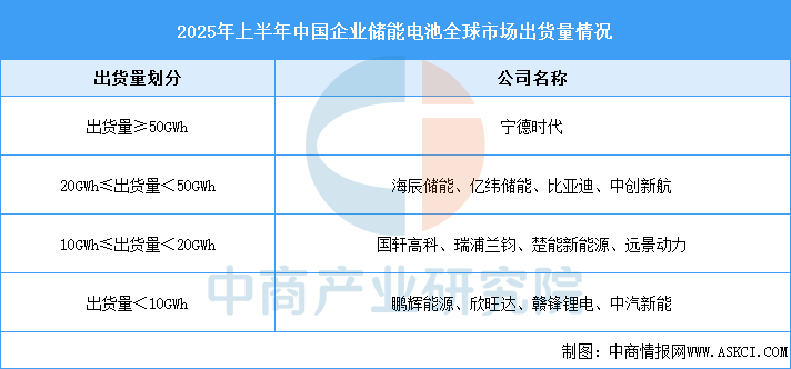 2025年上半年,中国企业储能电池全球市场出货量达233.6GWh。从企业出货量来看,宁德时代稳居榜首,出货量大于50GWh,海辰储能、亿纬储能、比亚迪、中创新航出货量在20GWh到50GWh之间,国轩高科、瑞浦兰钧、楚能新能源、远景动力出货量在10GWh到20GWh之间、鹏辉能源、欣旺达、赣锋锂电、中汽新能出货量少于10GWh。