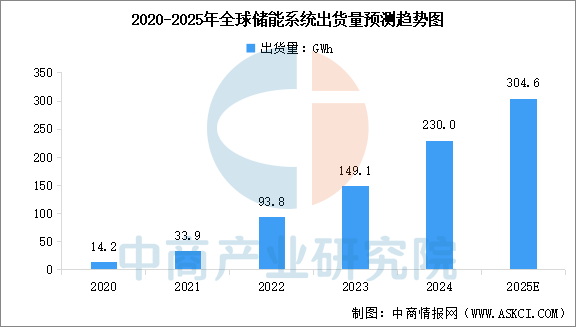 全球可再生能源需求激增,太阳能与风能装机容量迅猛增长,推动了储能系统的广泛应用。中商产业研究院发布的《2025-2030年中国储能系统深度分析及发展前景研究预测报告》显示,2020年至2024年全球储能系统出货量由14.2千兆瓦时增至230千兆瓦时,年复合增长率为100.6%。中商产业研究院分析师预测,2025年全球储能系统出货量将达到304.6千兆瓦时。