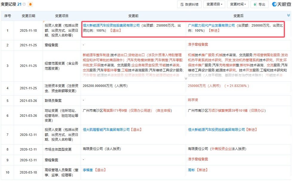 天眼查显示,恒大系两家子公司恒大新能源汽车(广东)有限公司、恒大智能汽车(广东)有限公司均于11月18日发生工商变更,实控人均由恒大新能源汽车投资控股集团有限公司变更为广州产投等6家广州国资企业共同持股的广州聚力现代产业发展有限公司。