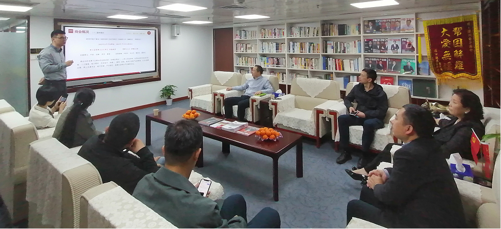 姚振雷副秘书长向各位领导介绍商会发展历程、组织架构、服务板块、行业交流、学术研讨、海外市场拓展及近期支援疫情防控等情况。
