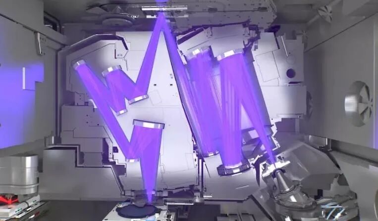 极紫外光物理特性与一般常见的紫外光差异极大。这种光非常容易被吸收,连空气都不透光,所以整个生产环境必须抽成真空;同时,也无法以玻璃透镜折射,必须以硅与钼制成的特殊镀膜反射镜,来修正光的前进方向,而且每一次反射仍会损失 3 成能量,但一台 EUV 机台得经过十几面反射镜,将光从光源一路导到晶圆,最后大概只能剩下不到 2% 的光线。”这也是 EUV 机台如此耗电的主因之一。