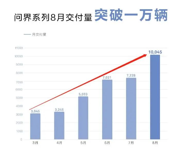 8月份,华为与小康合作的AITO旗下的问界系列汽车,销量超过了1万台,达到了10045台,真正的实现了月销过万的目标了。
