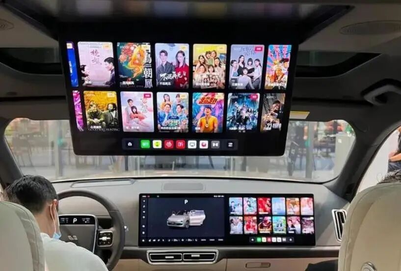 然后后排有大屏幕,可以看电视,玩游戏,可以手势控制;还带有冰箱等……