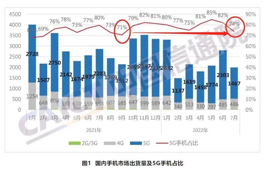 而综合1-7月份的数据,国内智能手机累计出货1.56亿,同比下滑23%,5G手机出货量1.24亿台,同比下滑17.7%,占比为79.3%。