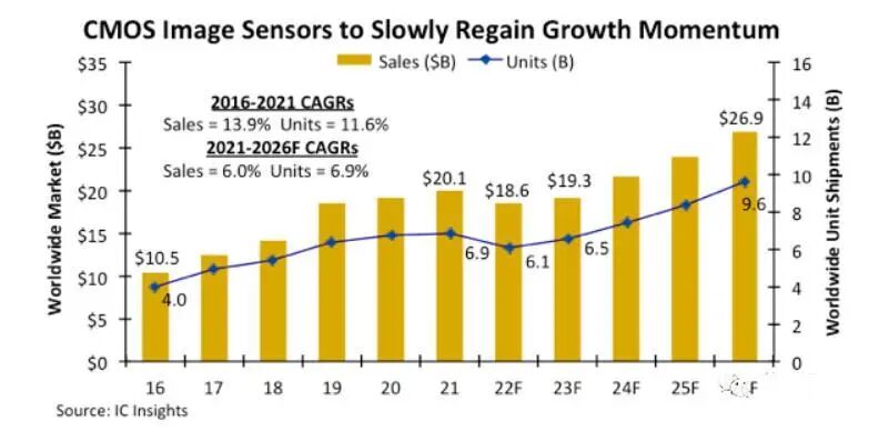 不过当时间到了2022年之后,高速增长的CMOS芯片市场形势大变,因为智能手机销量下滑,今年大砍旱,导致手机摄像头增长缓慢。再加上全球经济疲软,预计CMOS图像传感器(CIS)的销售额将出现13年来的首次下滑。
