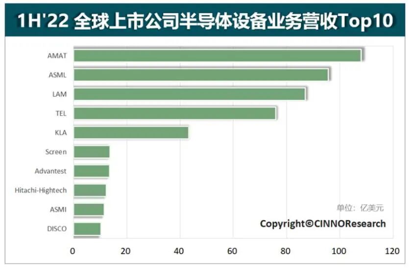 不信,我们看数据,上图是2022年上半年全球10大半导体设备营收排名情况。