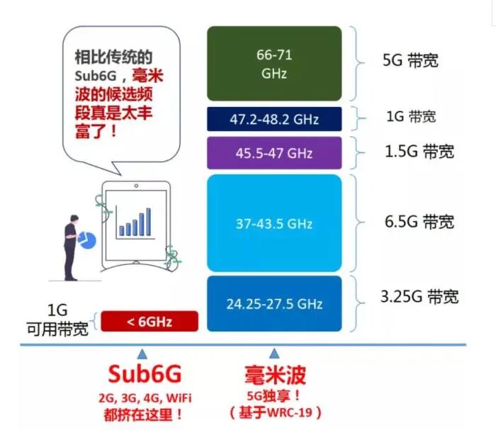 众所周知,5G标准中,5G的频率有两段,一段是Sub-6,频率范围在6GHz以下,大家习惯称之为厘米波,还有一段是频率超过25GHz的频率,大家习惯称之为毫米波。