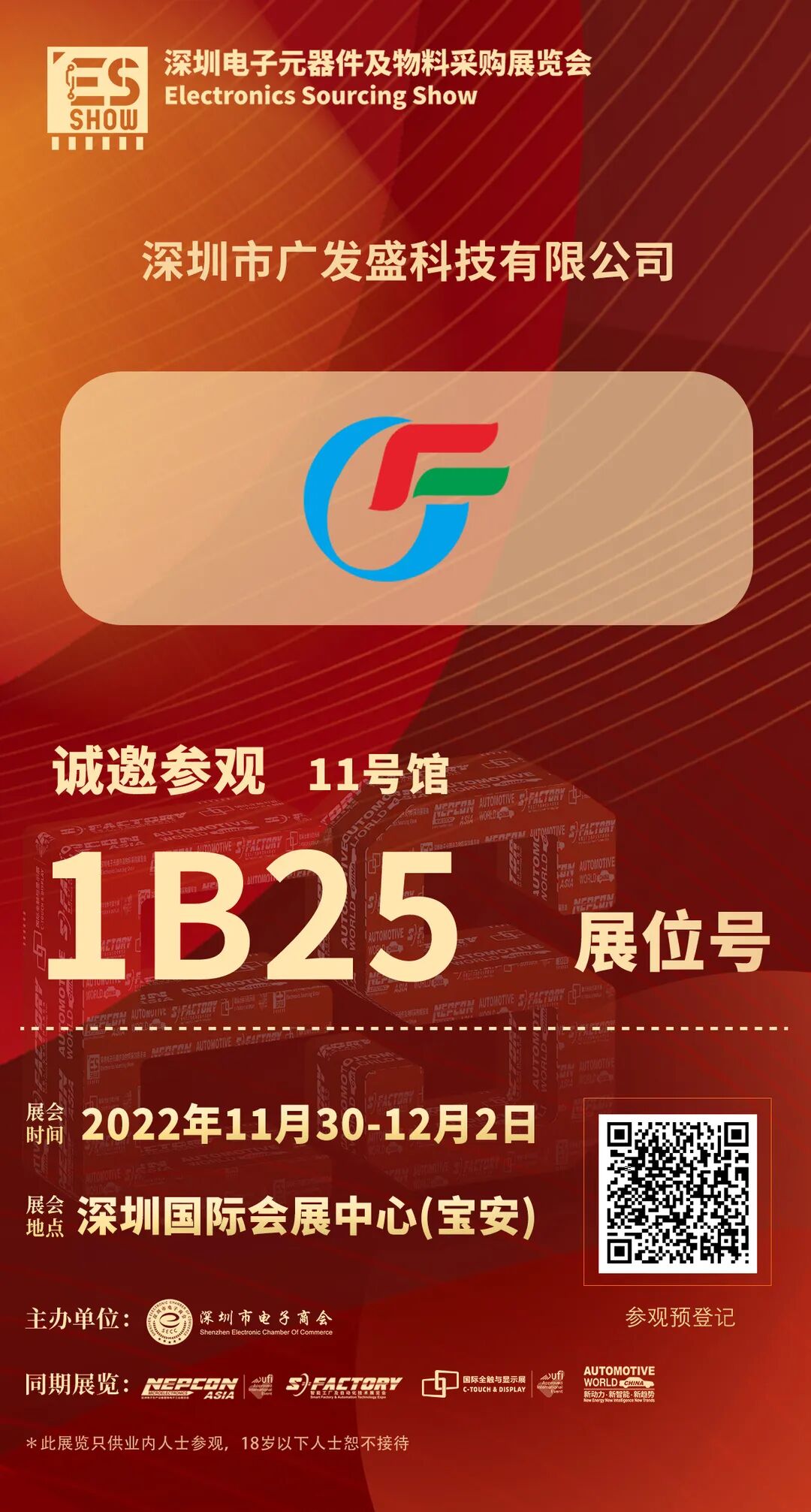 2022 深圳电子元器件及物料采购展览会,将于11月30日-12月2日在深圳国际会展中心(宝安)闪亮登场,隆重开幕。深圳市广发盛科技有限公司期待您的到来,11号馆1B25展位,赶紧收下此邀请函,码上登记,我们不见不散!