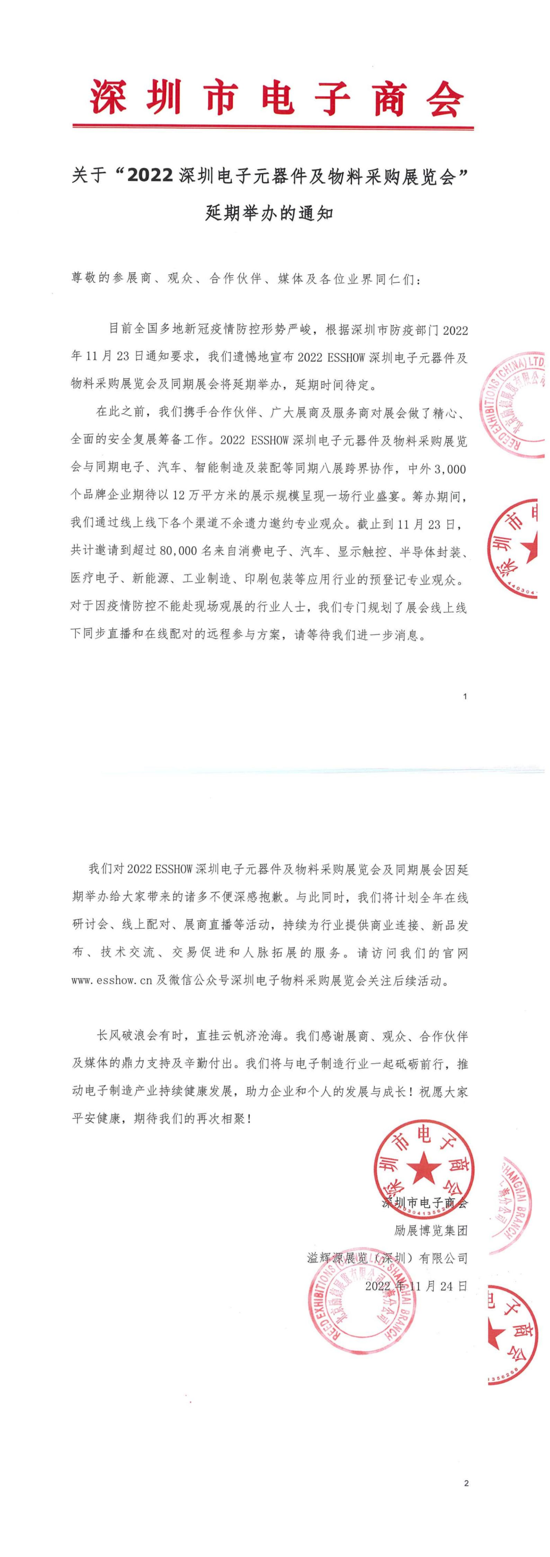 关于2022 ESSHOW 深圳电子元器件及物料采购展览会延期举办的通知