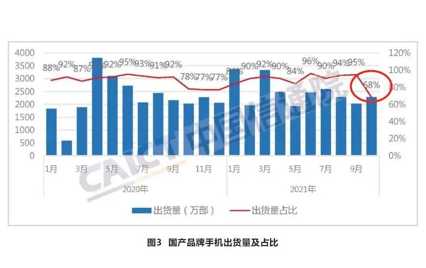 另外信通院还发布了另外一个值得我们震惊的数据,那就是10月份这3357.5万台手机销量中,国产品牌手机出货量2281.1万部,占比为67.9%。