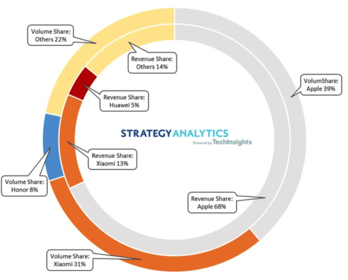 事实上,早几天前,知名分析机构Strategy Analytics发布了一份国内双11的手机数据,上面也显示,苹果是双11的大赢家。