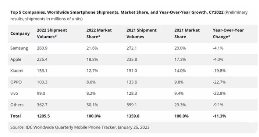 近日,IDC公布了全球智能手机销量排名,三星、苹果、小米、OPPO、VIVO位列前5名,其中三星销量更是高达2.6亿台,相比2021年,份额还增加了1.6%。