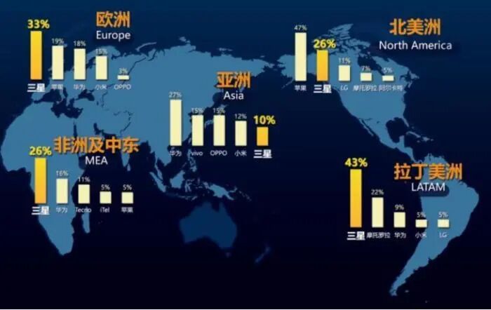 如上图所示,这是三星手机在全球的销售排名情况,除了北美打不过苹果,亚洲打不过国产手机外,在欧洲、非洲及中东、拉丁美洲全是排名第一,没有对手。