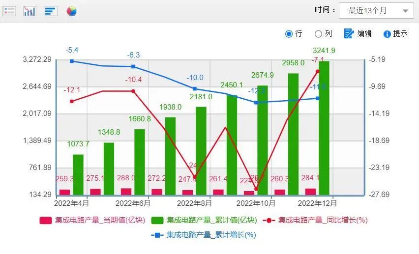 按照统计局的数据,2022年12月份,国内集成电路的产量是284.1亿块,同比下滑7.1%。而2022年累计生产集成电路3241.9亿块,累计同比下滑11.6%。
