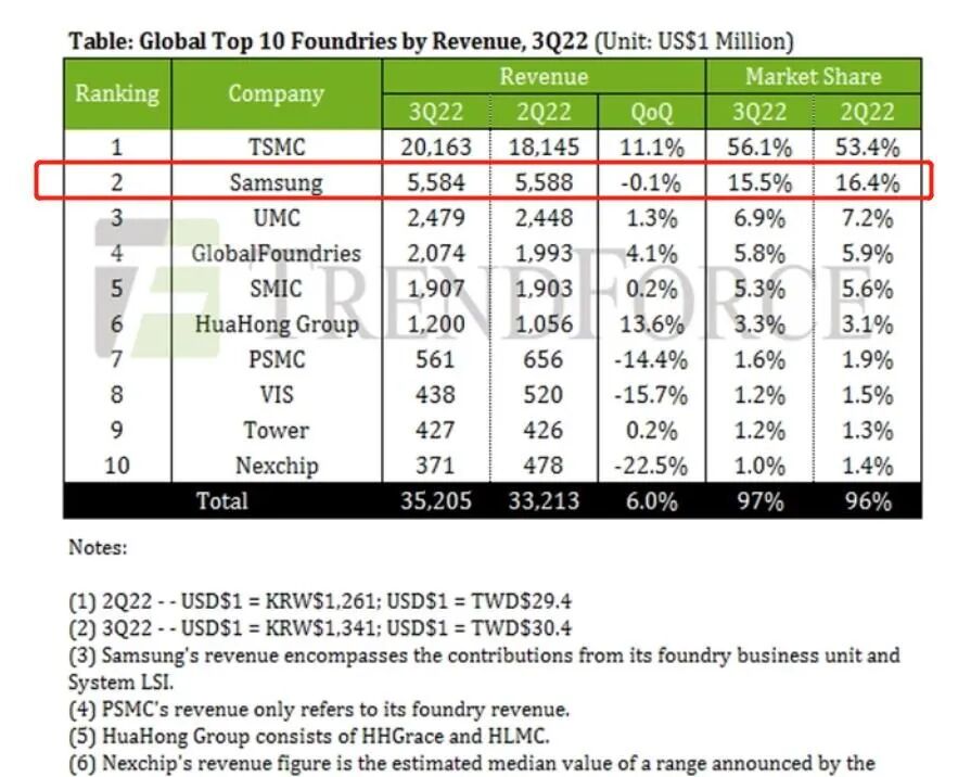 别看三星不如台积电市场份额高,但其实三星排名全球第二,份额约为16%,差不多是联电、格芯、中芯这三家排名全球第三、四、五名三家厂商的份额之和,产能还是相当大的。