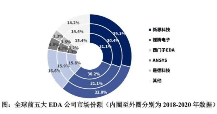但目前的EDA市场,基本上被三大巨头Synopsys、Cadence,Siemens EDA(位于美国,被西门子收购)垄断,这三大巨头,占了全球80%+的市场。