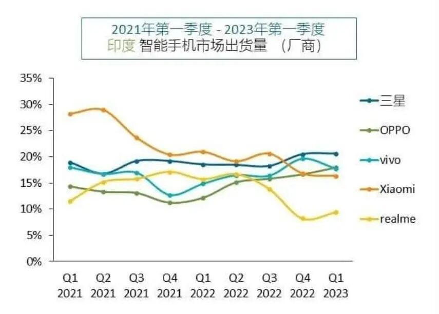 按照上图Canlys的数据,小米在一季度的时候,销量已经跌至印度第四了,份额跌至15%左右了,较高峰时的30%+,跌了一半多。而现在前三名是三星、OPPO、VIVO这三大厂商。
