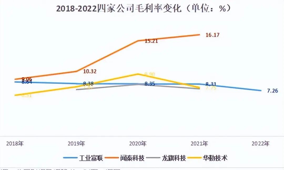 不信用数据说话,这是当前4家手机代工大厂,工业富联(富士康的上市主体)、闻泰科技、华勤技术、龙旗科技最近几年的毛利率数据。