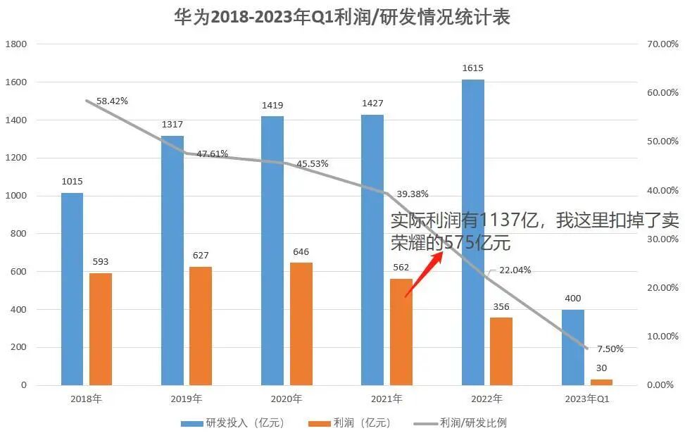 从这个图,我们可以很明显看到,因为打压的原因,华为不得不投入更多的钱来研发,支出变多了,自然利润就不断的下滑了。