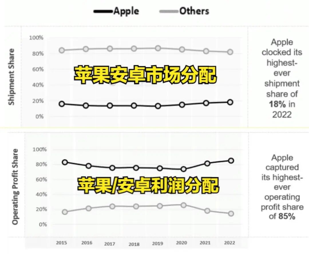 下图是机构的数据,2022年苹果以18%的市场份额,拿走了85%的利润,更是创下了新高。
