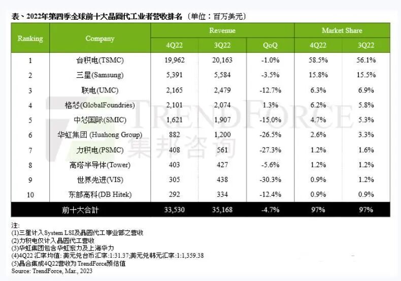 数据显示,2022年4季度,前10大晶圆厂营收为335.3亿美,同比下滑了4.7%,这也是最近几年以来首次下滑。