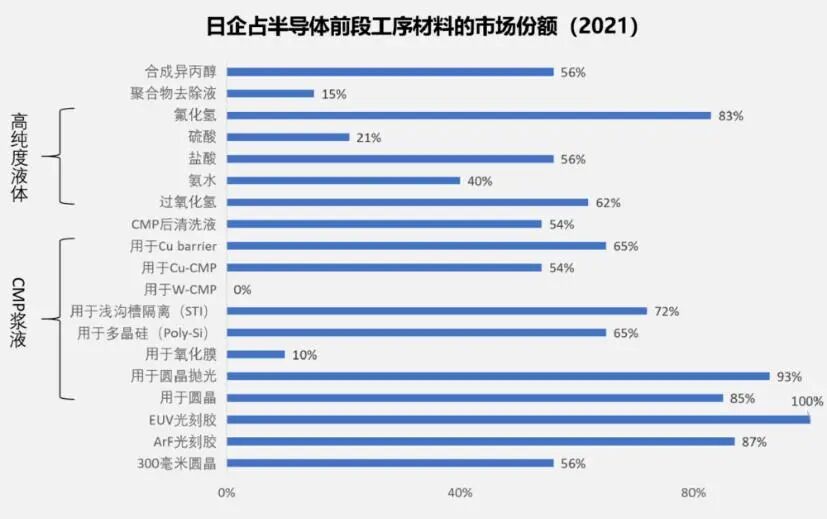 在这个前道工序,比较关键的材料有19种,也就是上图所列的这些,而其中14种都由日本企业主导,日企占全球份额超过50%。