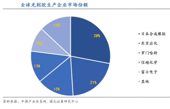 从全球光刻胶市场来看,日本掌握最领先的光刻胶配方和工艺,东京应化、JSR、富士、信越化学、住友化学等日本厂商占据80%以上市场份额。