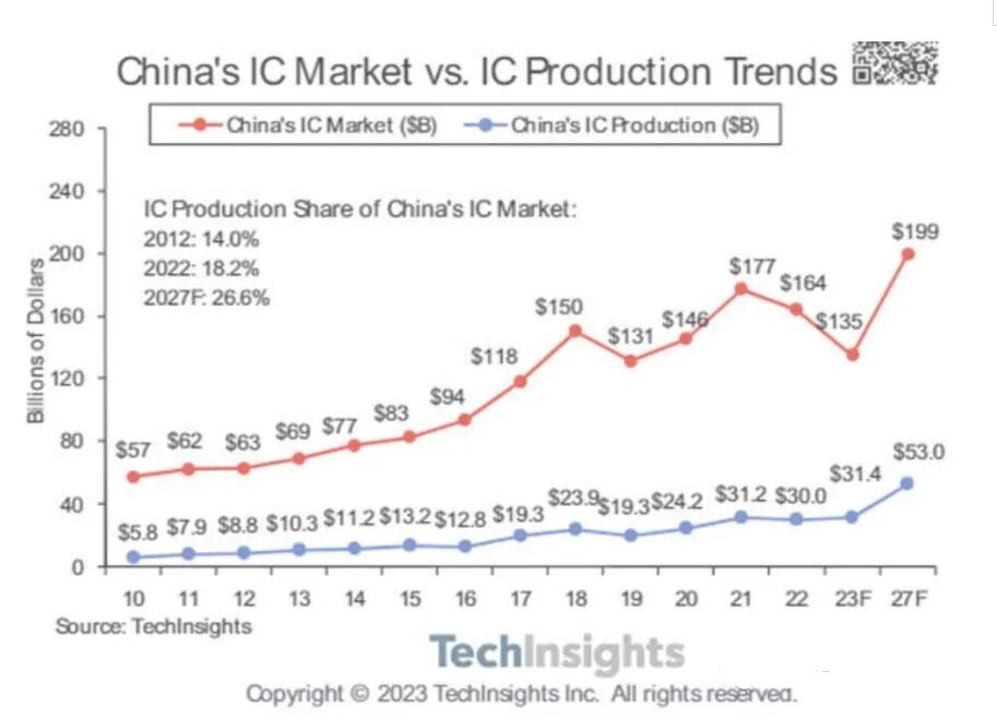 也就是说,TechInsights认为到2027年时,中国芯片自给率,不可能达到70%,甚至连30%都达不到,只有26.6%。