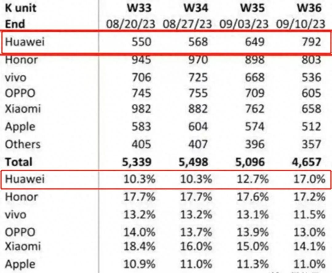 不得不说,这次的华为Mate60系列上市销量,真的是火爆整个智能手机圈。而按照机构的数据,第36周的时候,华为在国内的份额已经达到了17%,排名国内第二名了。