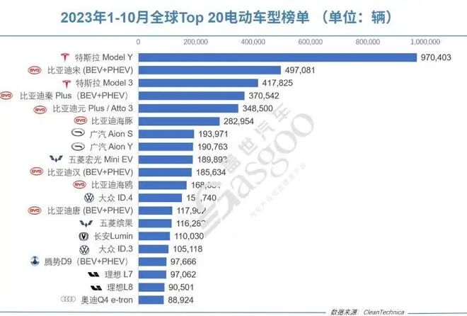 接着我们看上图,也就是全球销量排名前20的榜单,可以看到特斯拉Model Y是断层式领先,高达97万辆,再是比亚迪宋,再到特斯拉Model 3。