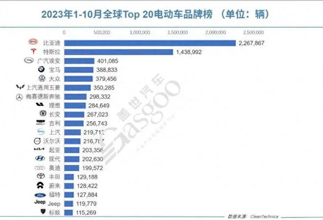 离2023年结束还有10来天,那么2023年的电动汽车市场表现究竟如何呢?近日,知名机构统计了1-10月份的品牌销量,可以让我们来一看究竟了。