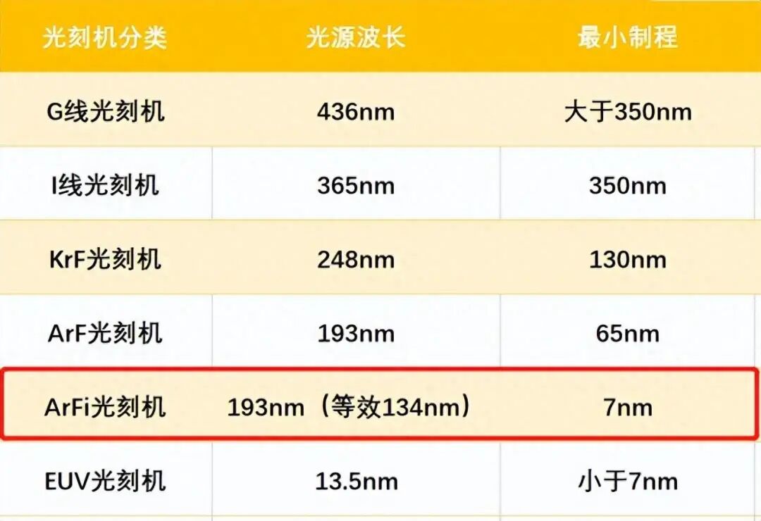ArF对应的是130-65nm;而ArFi是ArF的改进版,也称之为浸润式DUV光刻机,对应的是65-7nm;EUV是极紫外线光刻机,对应的是7nm以下。