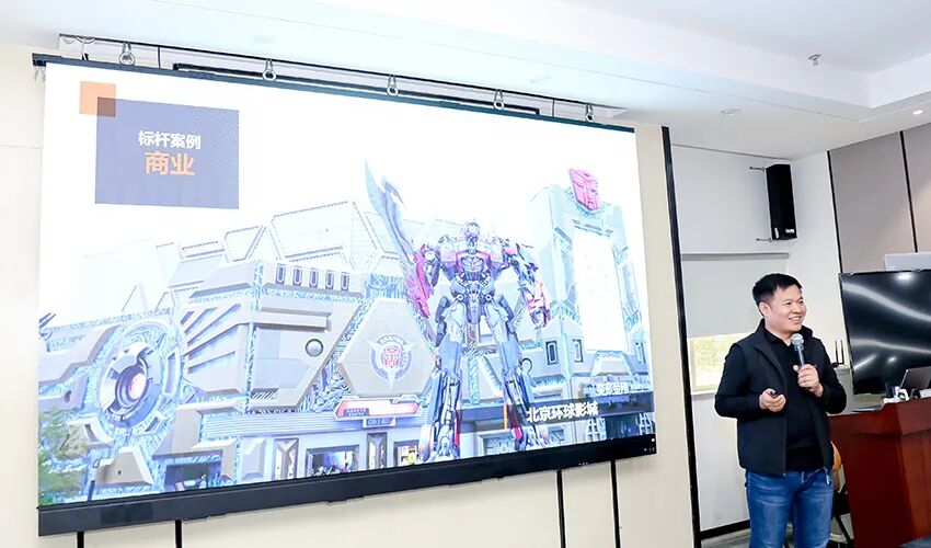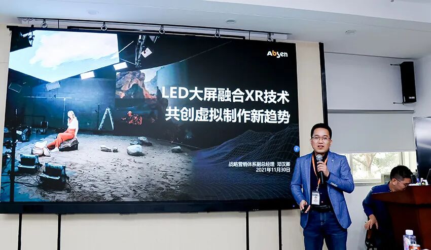 丁崇彬总经理、赵凯副总裁、邓汉卿副总经理分别作《数字艾比森》、《至真至诚 向新而行——艾比森八大标准》、《LED大屏融合XR技术共创虚拟制作新趋势》主题报告。